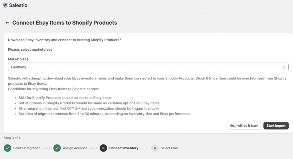 After adding the account, select the eBay marketplace and start the import. Salestio will automatically fetch the eBay product list and link matching items. You can find the results later in a Selling List that will be created automatically.