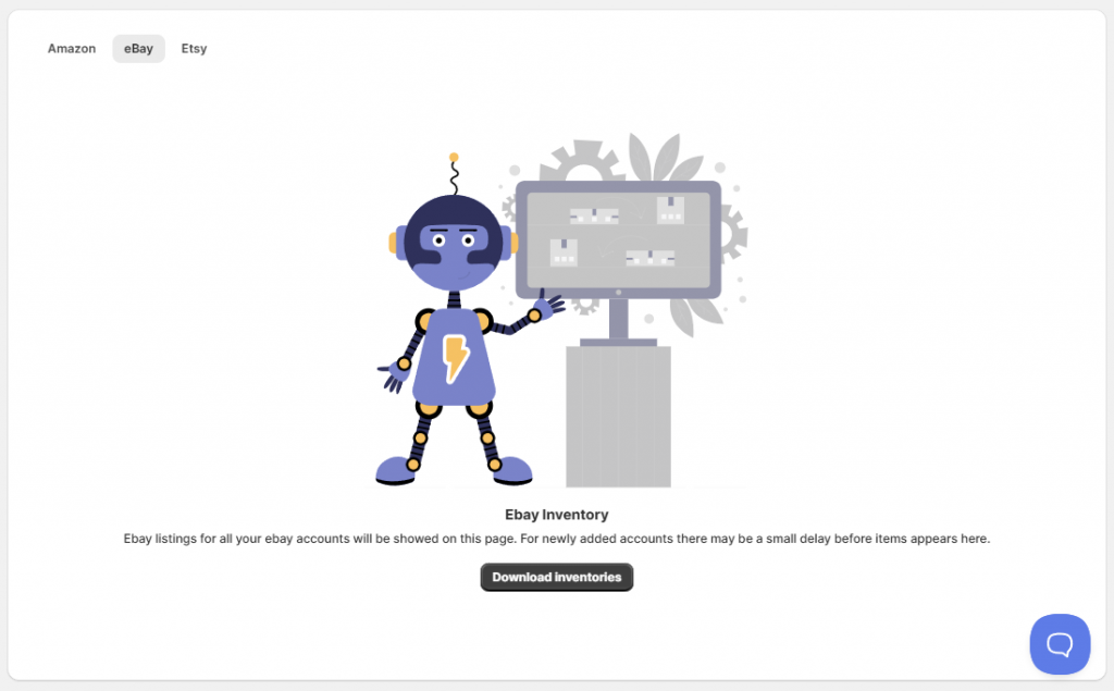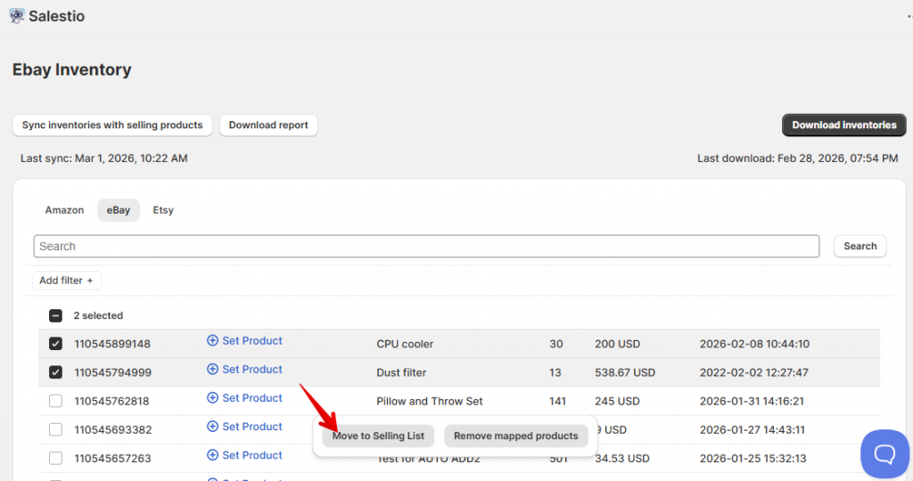 Retrieve the eBay listings on the account to start the linking process. Go to Salestio > Inventory tab and click “Download inventories” to get started. When multiple eBay accounts are connected, they will appear as selectable options. Select the target account and click “Download”.