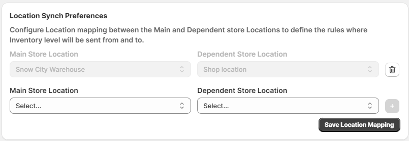 In this section, map the Main store Shopify Locations to the Dependent store Locations. The selection here is up to you and provides options to organize the inventory across the different shops.