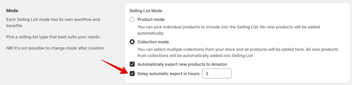 When the “Automatically export new products” is enabled in Collection Mode, new products are published right away by default. The new option lets sellers delay this action by a specified time: