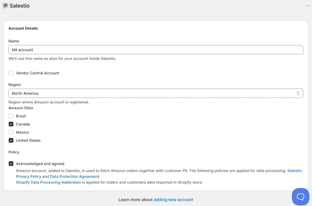 À l'étape suivante, vous serez redirigé vers votre compte Seller (Vendor) Central pour confirmer les autorisations de Salestio. Vérifiez et confirmez. Après cela, le compte Seller Central est prêt à être utilisé. Vous pouvez confirmer son statut en vérifiant le badge dans l'onglet Comptes.