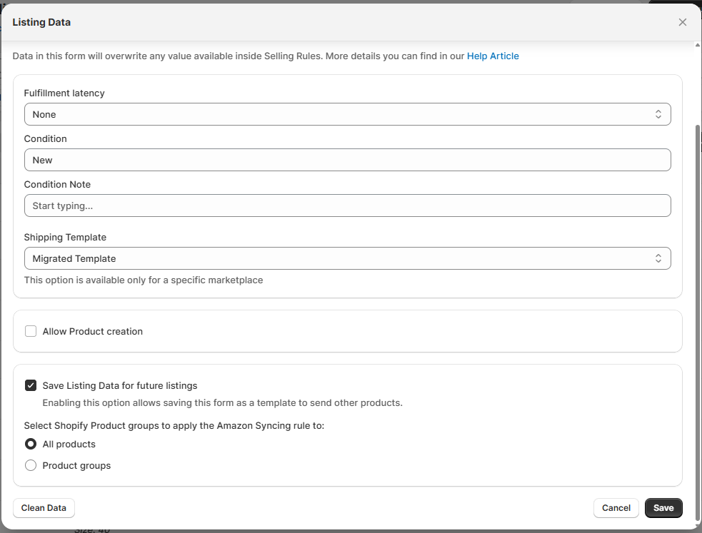 Après avoir enregistré les données d'annonce pour un produit, vous pouvez l'envoyer immédiatement ou le convertir en règle de synchronisation (option "Enregistrer les données d'annonce pour les futures annonces"). Lorsque cette option est activée, tous les paramètres ci-dessus seront convertis en règle de synchronisation Amazon, que vous pourrez modifier ultérieurement (plus d'informations à ce sujet dans la section suivante). Vous pouvez enregistrer le préréglage pour toutes les annonces ou uniquement pour des types spécifiques (en fonction d'un type de produit, d'une collection ou d'une catégorie Shopify correspondant).