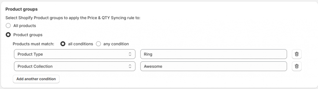 Les règles de synchronisation sont des règles globales pour les annonces de produits. Salestio applique la règle correspondante en fonction de la condition de collection, de catégorie ou de type de produit Shopify.