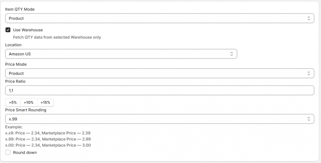 Définissez d’autres modes de synchronisation des produits, choisissez un entrepôt Shopify spécifique ou activez l’arrondissement des prix. Apprenez-en davantage sur les options disponibles pour personnaliser les prix et les quantités dans les articles de blogue respectifs. Les règles de prix et de quantité enregistrées peuvent être appliquées à n’importe quel compte ou marché.
