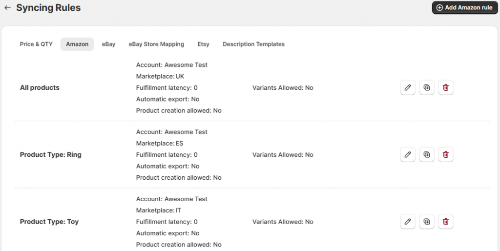 Si vous avez enregistré des préréglages de données de listing plus tôt, ils apparaîtront dans cet onglet. Ici, vous pouvez modifier ou ajouter d’autres modèles de données de listing pour vos articles Seller Central. Chaque modèle est enregistré pour un compte et un marché spécifiques. Si vous vendez sur plusieurs marchés, assurez-vous d’ajouter une règle de synchronisation pour chacun d’eux ou de configurer des données de listing individuelles pour le reste des produits sans modèle.