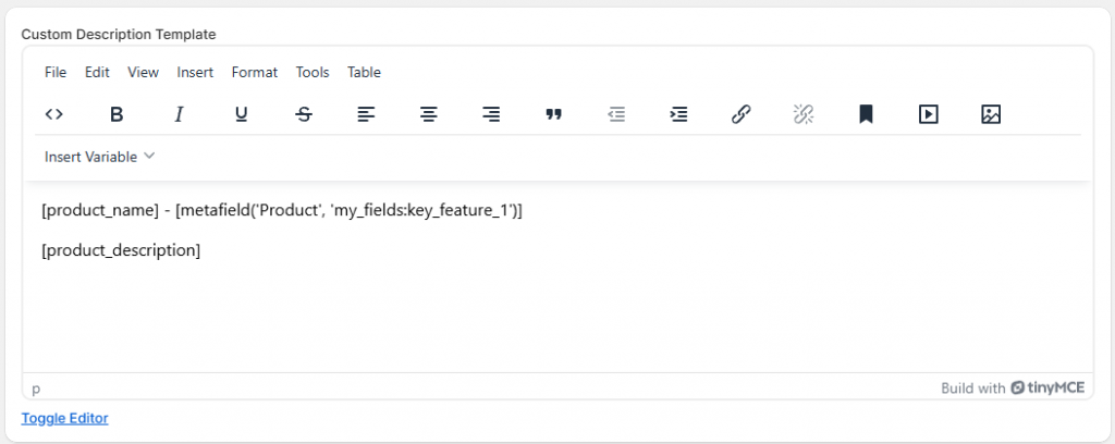 Dans les modèles de description, configurez un préréglage pour composer une description pour les listings du marché. Utilisez l’éditeur pour ajouter du texte personnalisé ou des informations sur le produit à partir de Shopify, y compris les méta-champs.