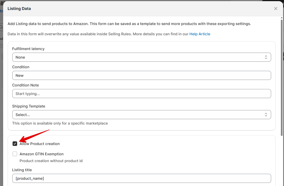 Ci-dessous, vous pouvez activer la création de produit. Cette section n'est nécessaire que lors de la publication de produits qui ne figurent pas encore dans le catalogue Amazon (articles qui n'ont pas d'ASIN). Si vous n'êtes pas sûr, ignorez cette section pour le moment.