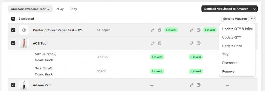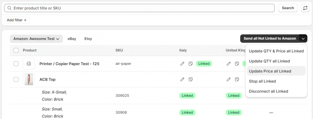 Salestio met automatiquement à jour les produits liés dans votre liste en fonction de la règle de synchronisation des prix et des quantités configurée. Si vous souhaitez mettre à jour les produits manuellement, consultez les actions groupées en haut de la page. Vous pouvez effectuer une mise à jour manuelle après avoir apporté des modifications à votre règle de prix et de quantité afin de les appliquer immédiatement.