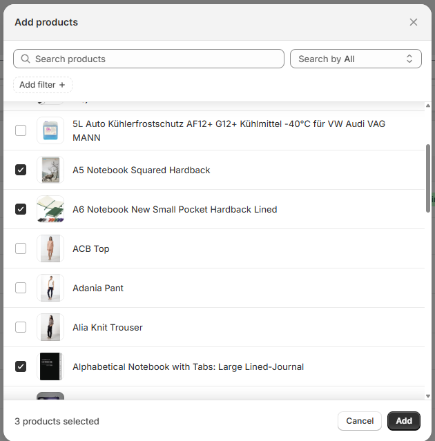Vous pouvez également sélectionner plusieurs éléments dans la liste à l'aide des cases à cocher. Cliquez sur les trois points en haut pour accéder aux actions groupées uniquement pour les produits sélectionnés :